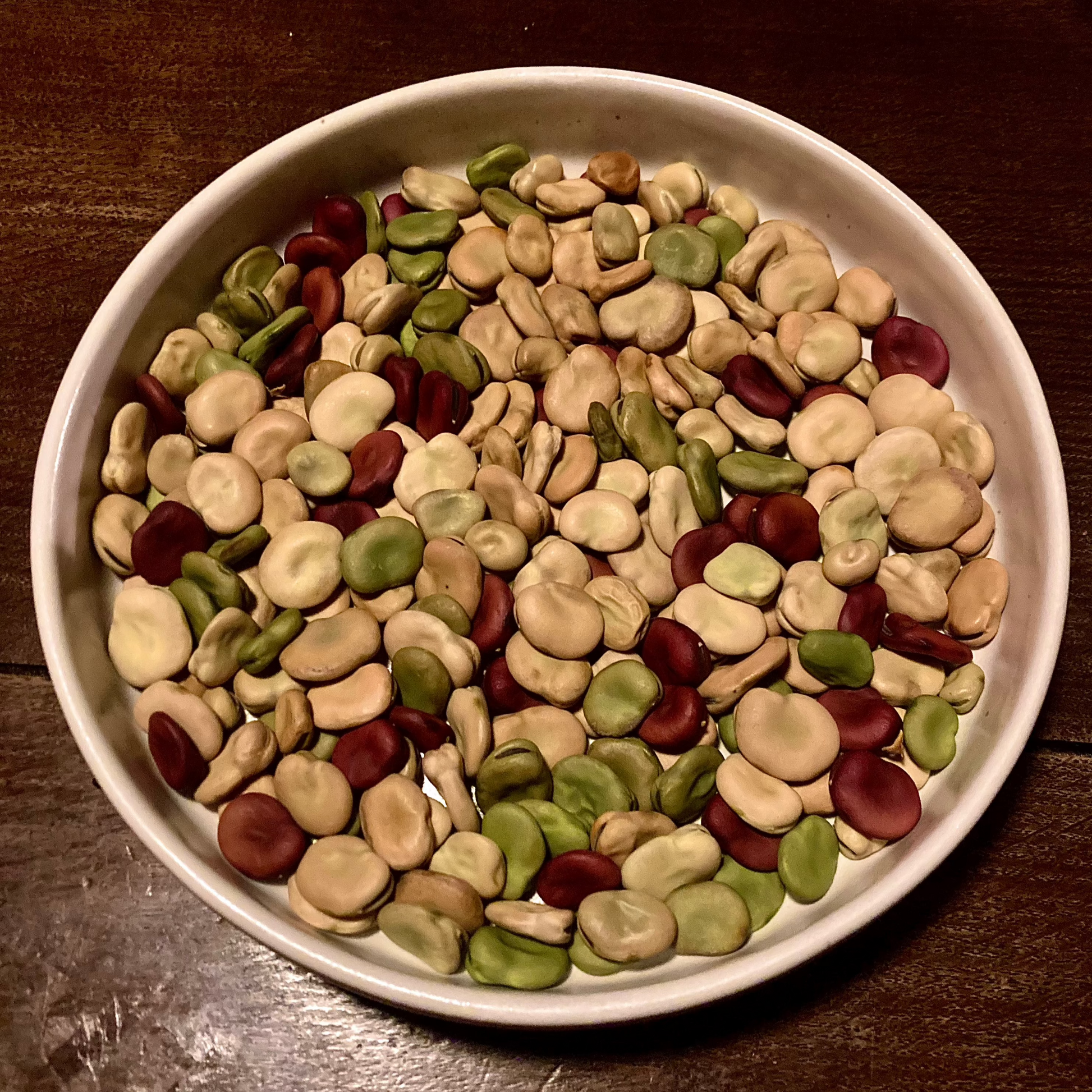 Hier handelt es sich um eine Massenkreuzung verschiedenster Herkünfte von "Vicia faba". Eine Tüte enthält alle möglichen Farben und Formen der dicken Bohne. Vicia faba weist im Gegensatz zur klassischen Bohne (Phaseolus vulgaris) sehr hohe Bestäubungs- und damit Verkreuzungsraten auf, was sie zu einer fantastischen Kandidatin für unsere Populationszüchtung macht. Sie ist unkompliziert und genügsam im Anbau.